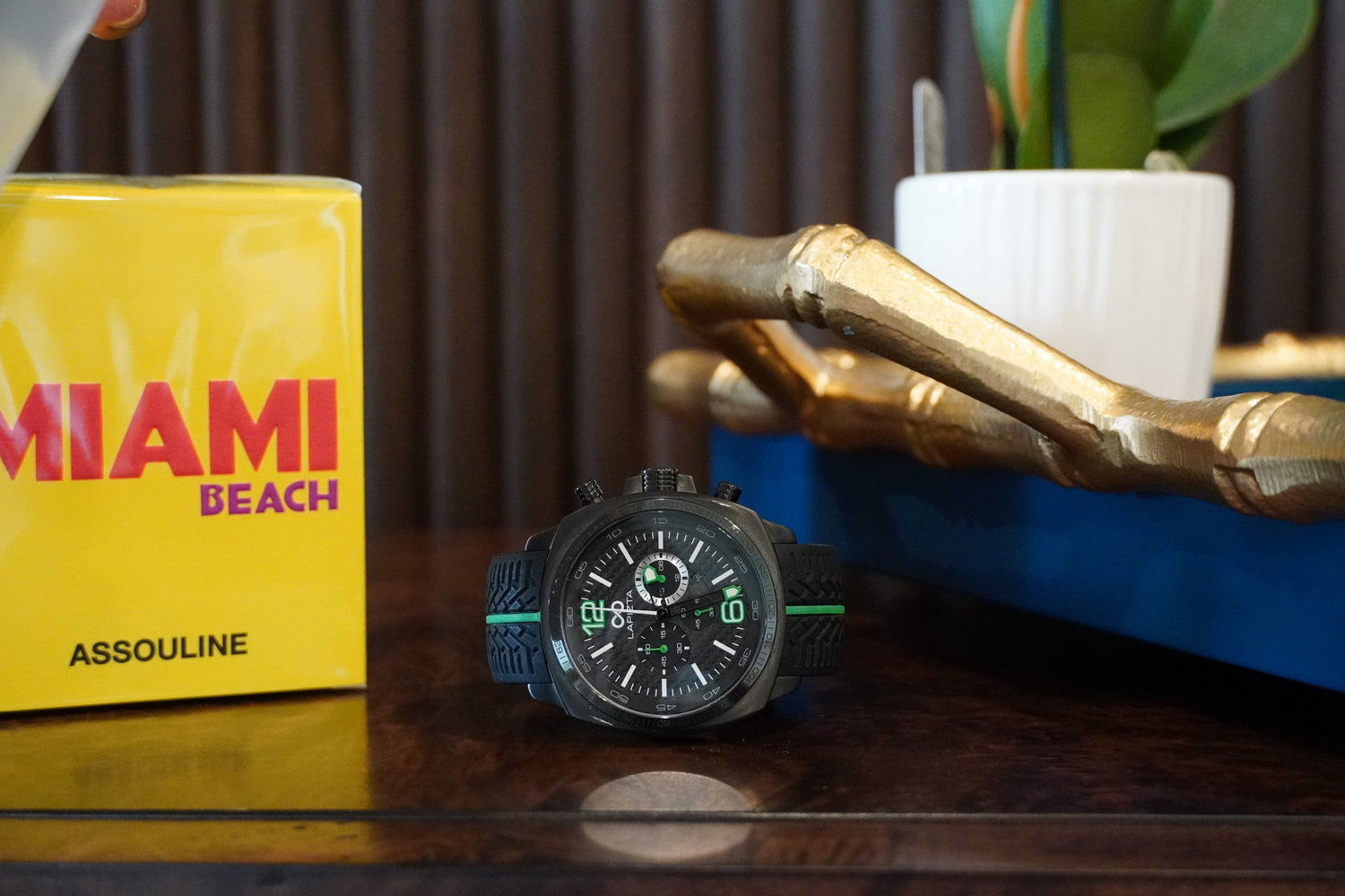 The Lapizta Audax L22.1303 pictured on-wrist while driving an Aston Martin.