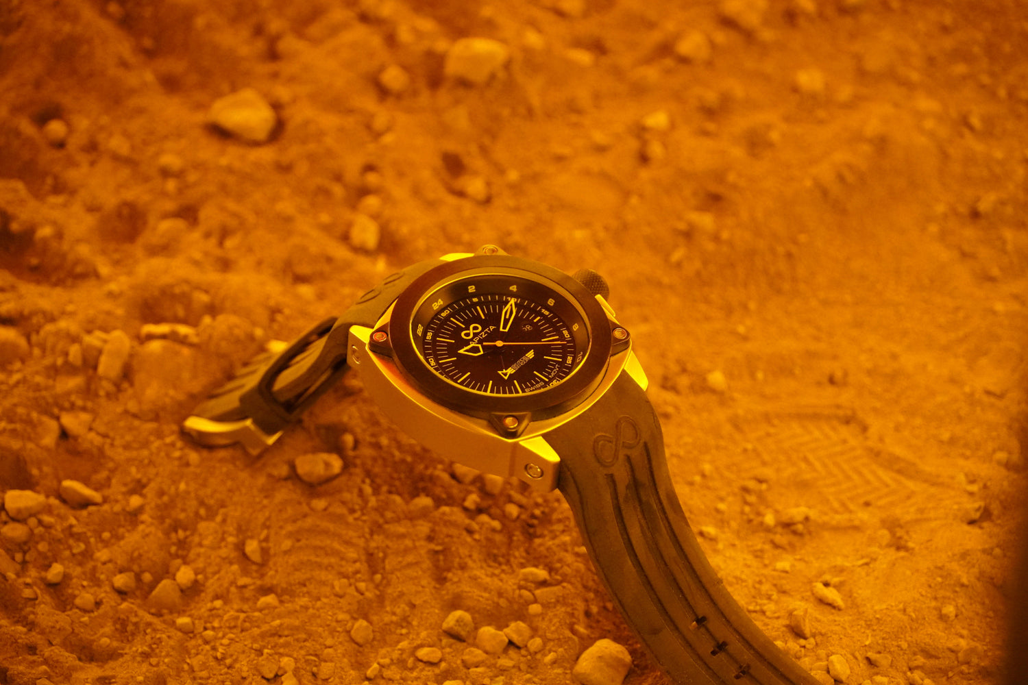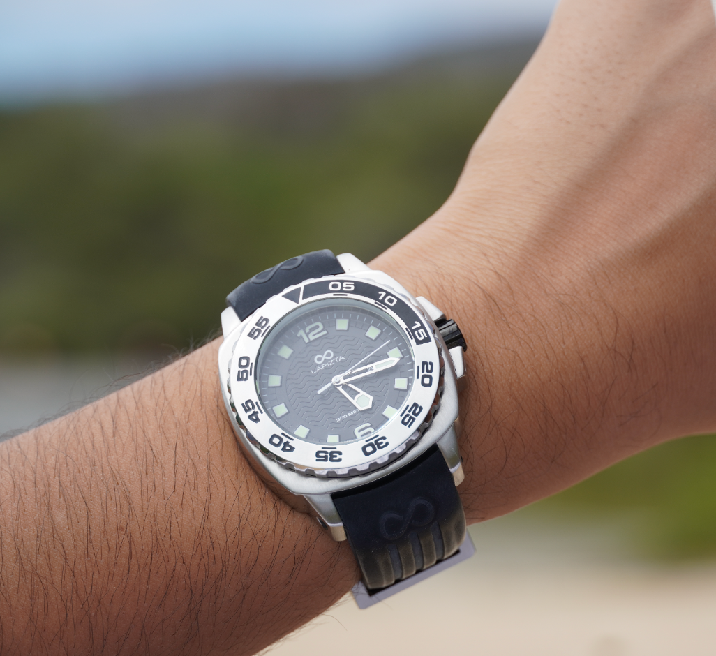 In the Galapagos Islands, Slate Watch Company scuba dove with sharks while wearing the Lapizta Izurus L24.1803. A shark can be seen on the right side of the image.